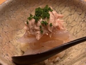 本日のご紹介は濃厚な肝がたまらない天然カワハギの小丼と旬の寒鰤の握り!脂乗り抜群な寒鰤は間に大根が挟んであり食感もお愉しみいただける一貫です。